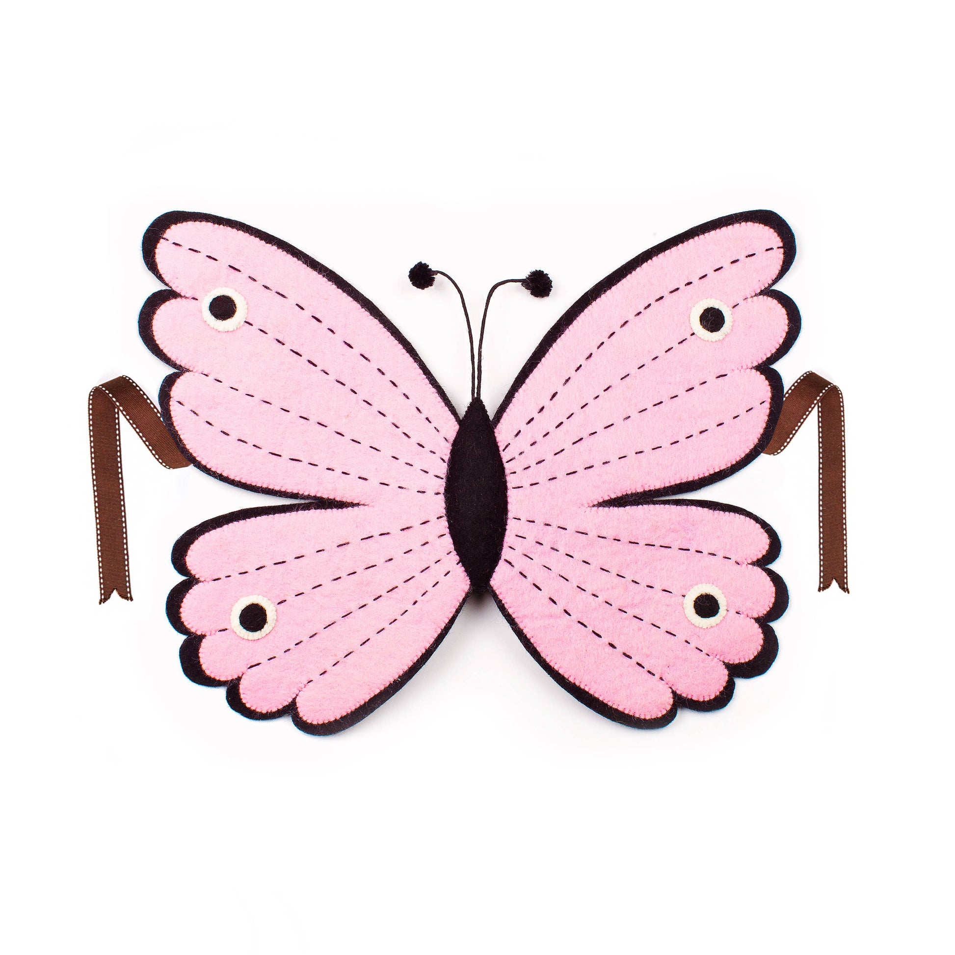 Exquisite needle felted detail brings each dressing up set to life while vintage saddle stitched ribbons tie securely around the back and across the chest. Opulent bows and power pinks are involved.