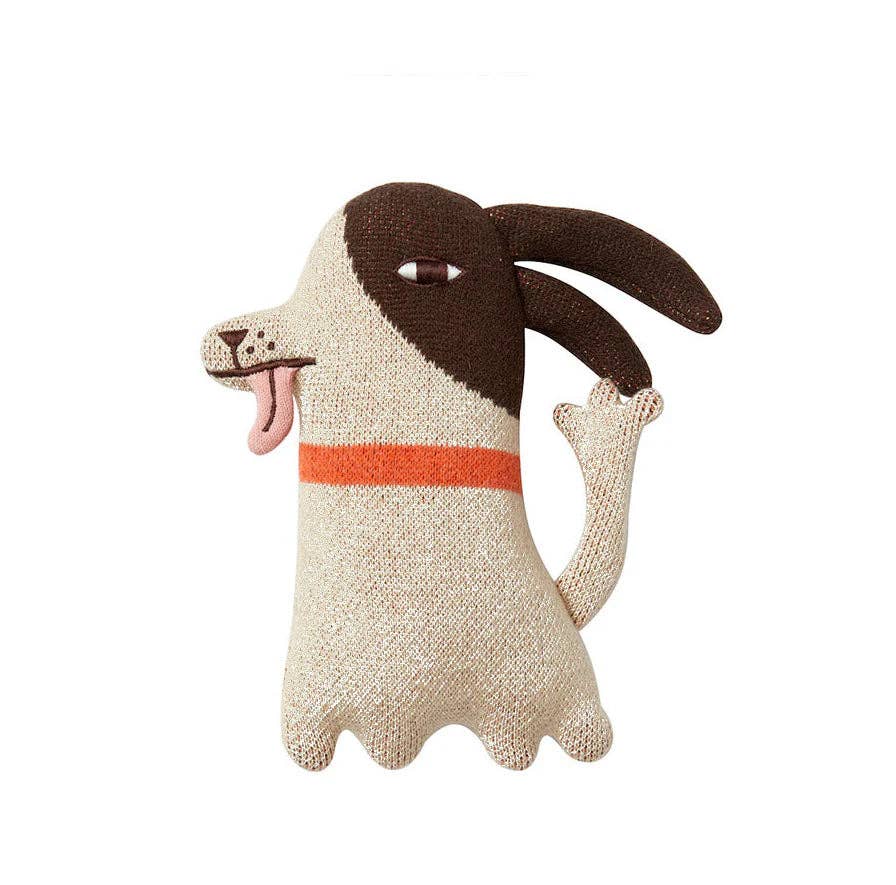Hand embroidered cotton soft toy dog with floppy ears, tail and tongue. Designed in the UK and part of Donna Wilson's Wee Ones collection. Perfect for gift retailers, nursery boutiques, and children's stores seeking unique collectible toys with storytelling appeal.