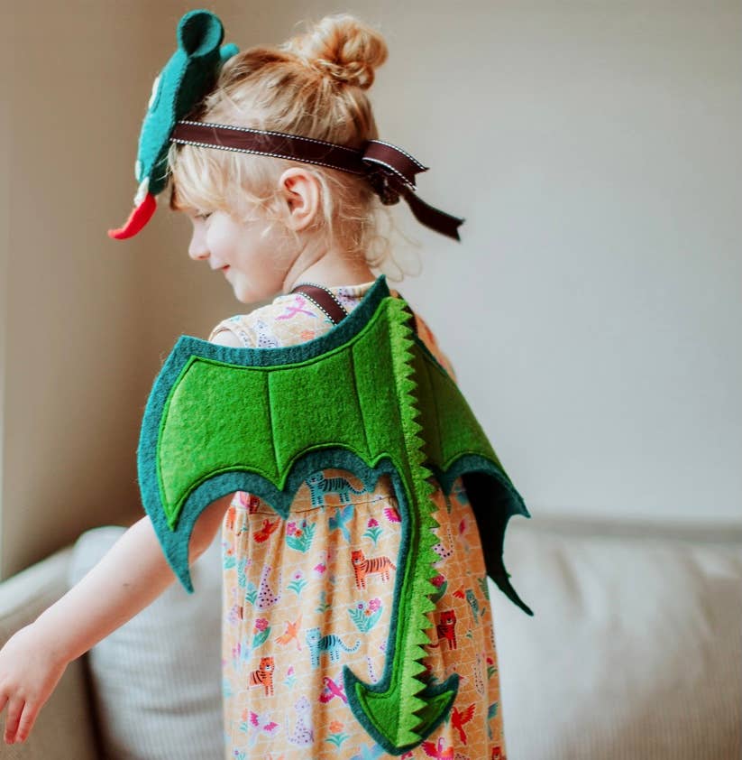 Fiery Dylan Dragon! Fabulous hand felted head dress with matching tie-on scaly wings and pointy tail. These eye catching dress up sets are perfect for some imaginative play.