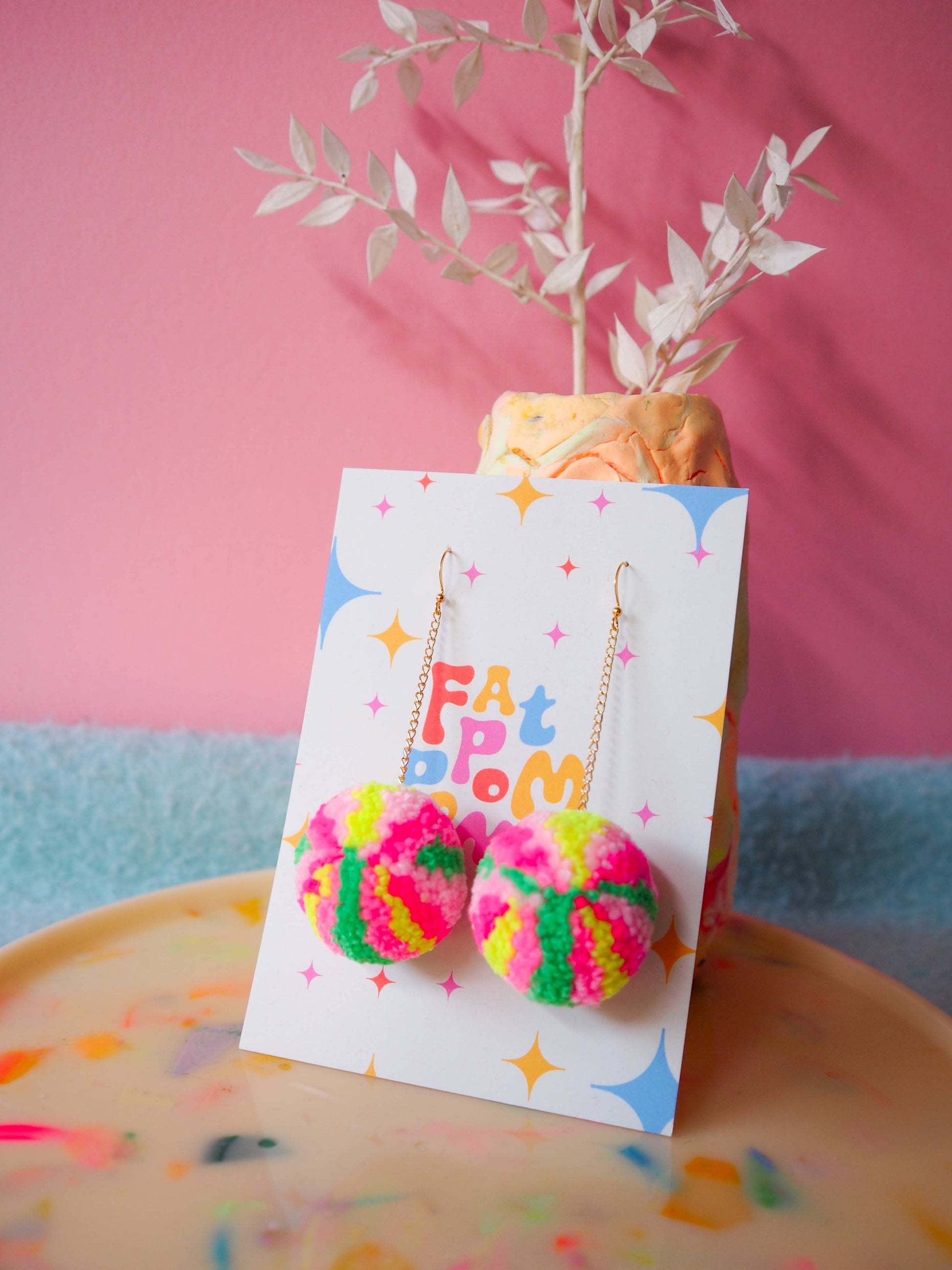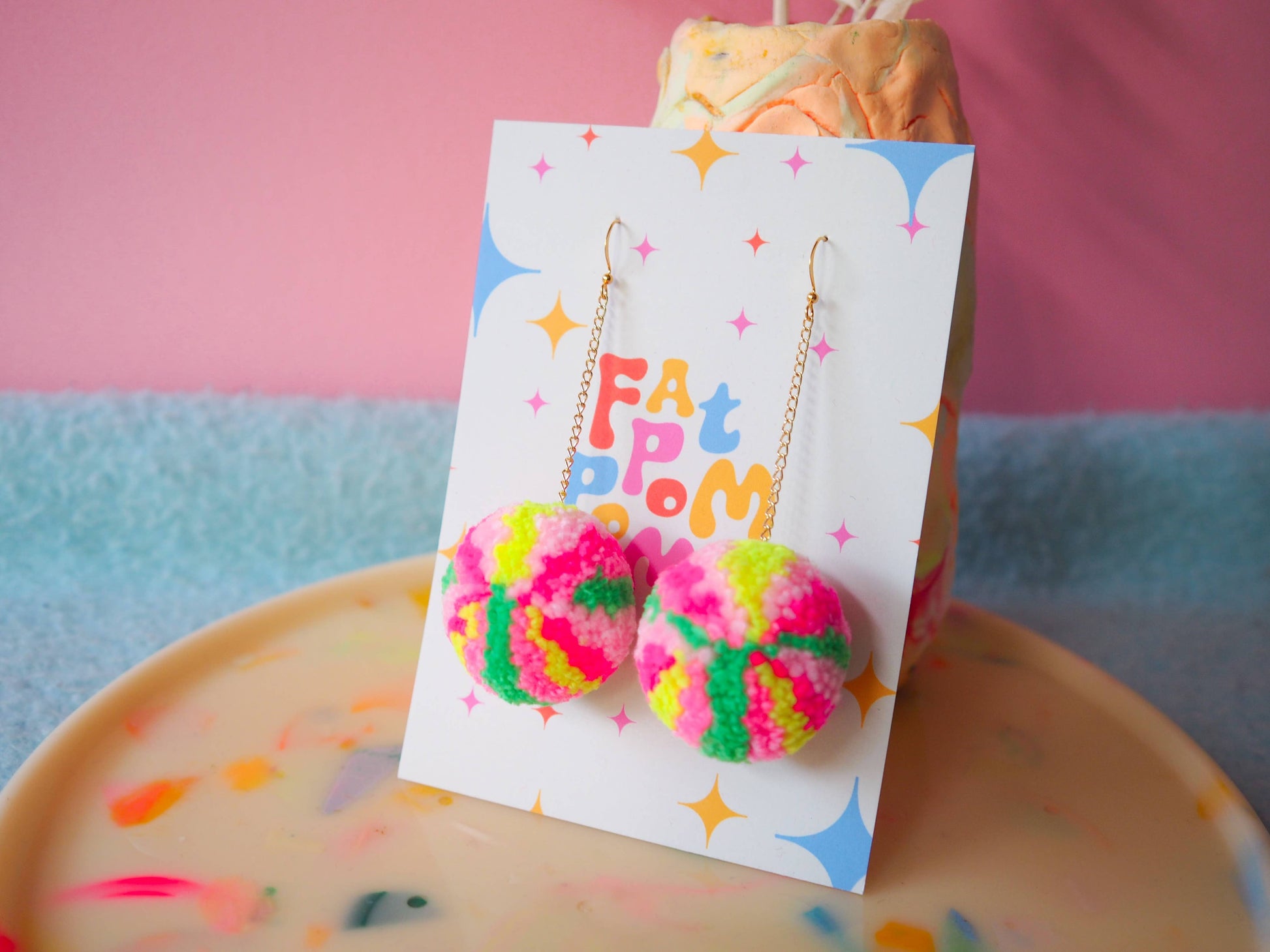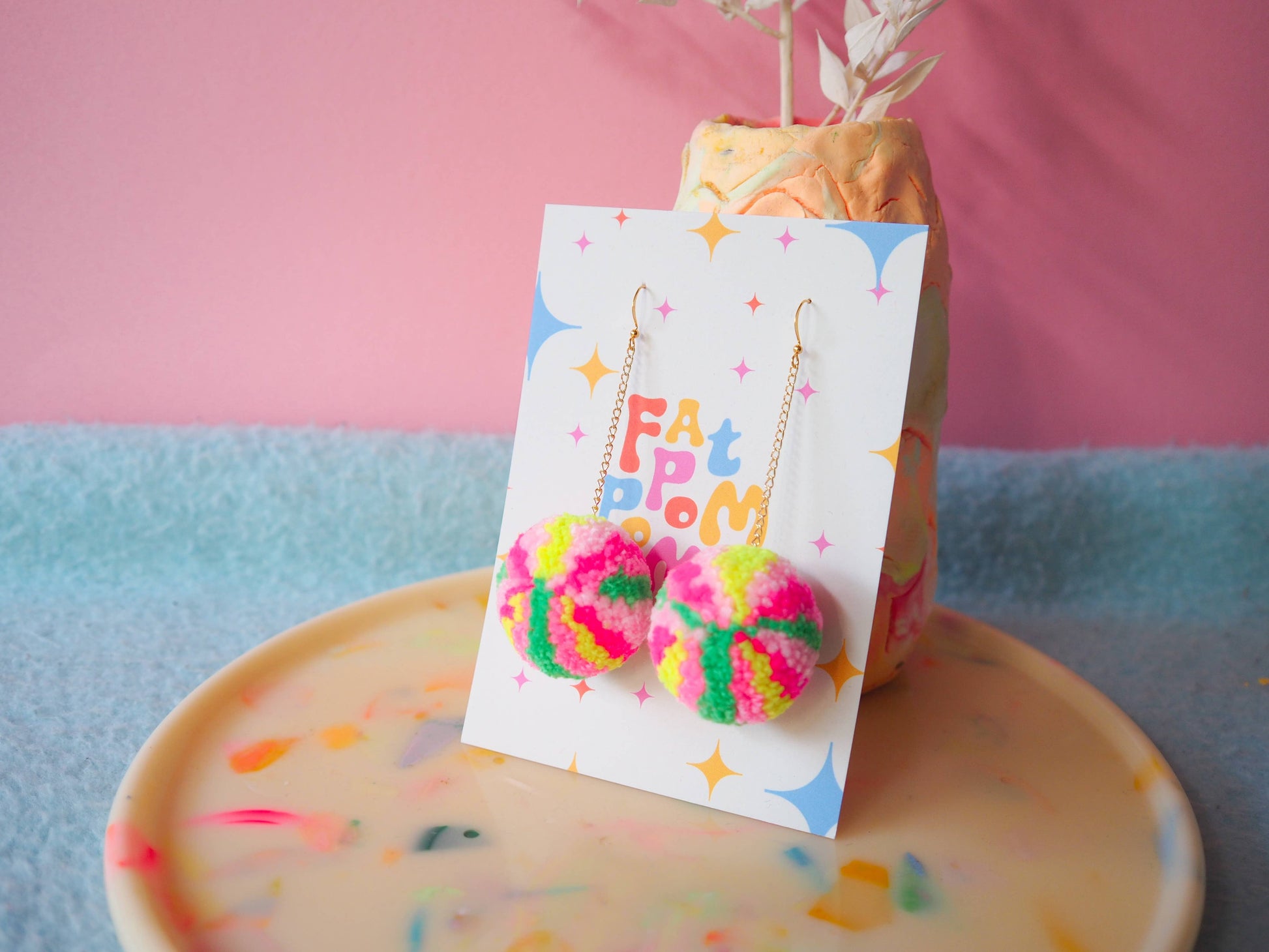 Our Christmas selection is here and of course we had to include a retro inspired ornament in Pom Pom form! Here at Fat Pom Poms we love all things retro and colourful which is a perfect match for any vintage Christmas decorations. Our Pom Pom earrings were the first things we created back in 2014 and they have been our most steadily popular item since then. Inject some fun into your day and try them out! * Made using the brightest, colourful-est acrylic yarn * Handcrafted in our studio in Margate, England * Packed beautifully * Unique Statement earrings * Choose from gold plated, silver plated or sterling silver * Clip on option available Details Size: 7-8 cm long Material: Acrylic Yarn Colour: Multicolour Shipping & Returns U.